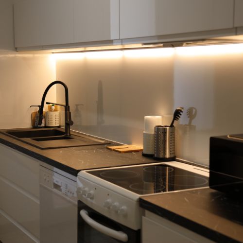 * Une cuisine toute équipée avec four, plaques de cuisson, micro-ondes, réfrigérateur, lave vaisselle machines à café, grille pain, bouilloire,