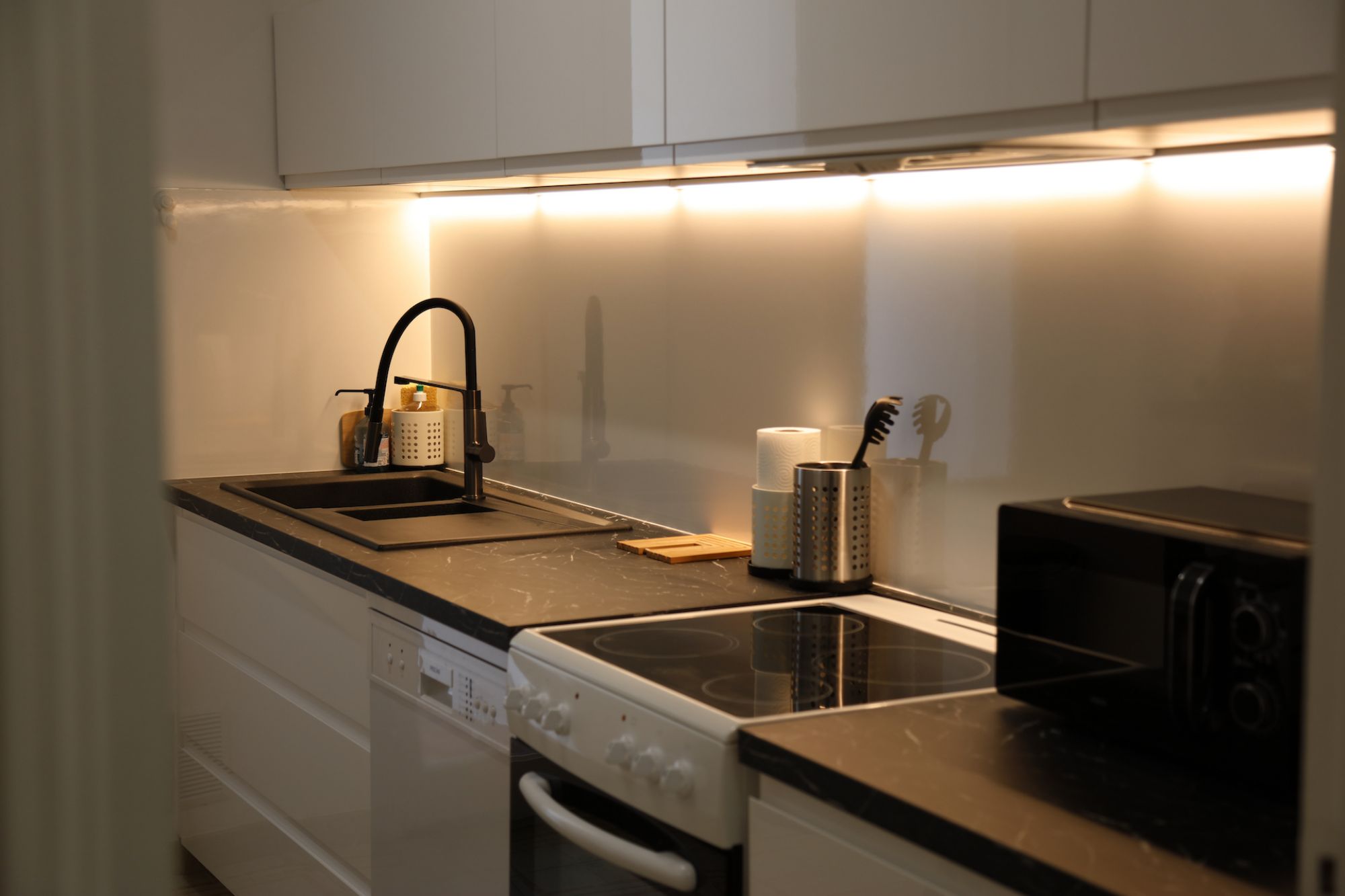 * Une cuisine toute équipée avec four, plaques de cuisson, micro-ondes, réfrigérateur, lave vaisselle machines à café, grille pain, bouilloire,